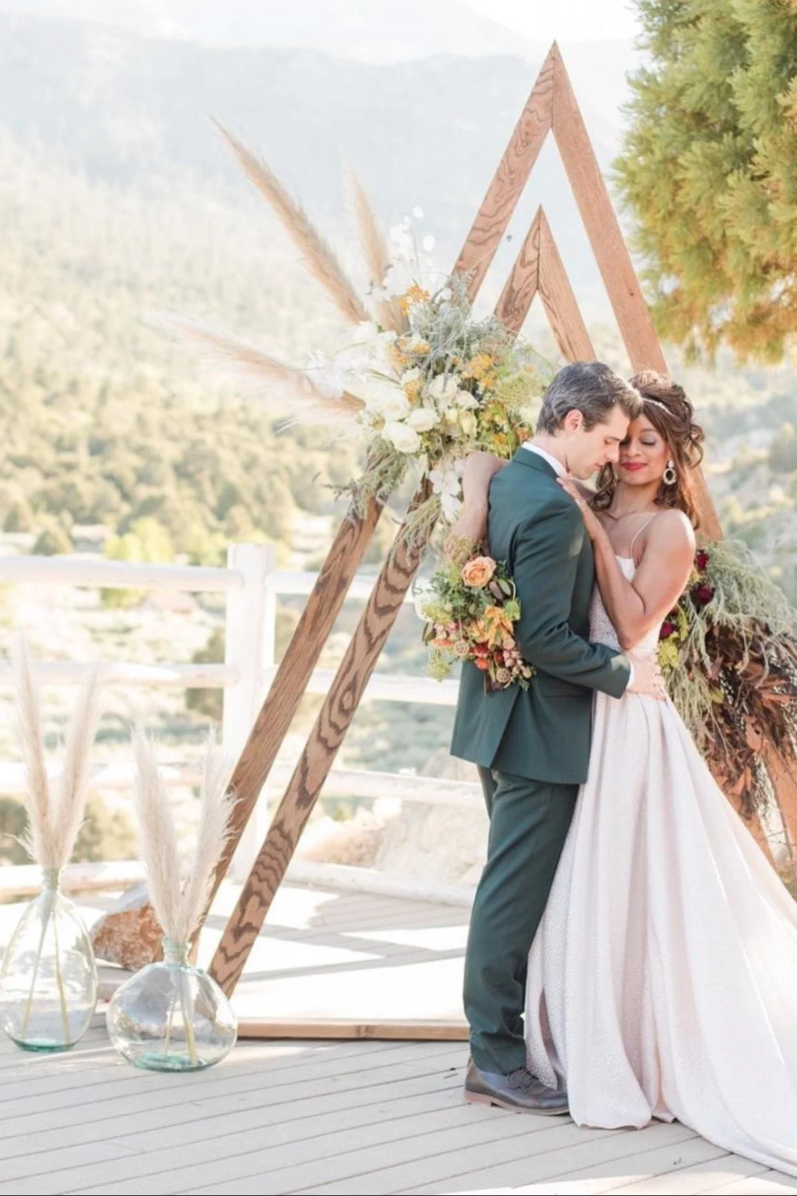 Double triangle arch: @bloomingbelleslv. Florals: @bloomingbelleslv @pam.bloomingbelles Venue: @retreatoncharlestonpeak. Photo: @sabrinawphotography